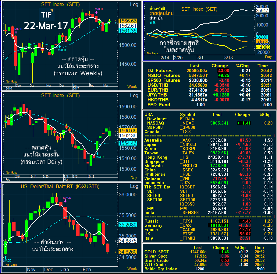 - SET Index เริ่มนั่งพัก หลังบวกติดกันมา 4 วัน แนวโน้มระยะสั้นยังเป็นขาขึ้น ส่วนระยะกลางยังเป็นขาลงอยู่ (ขาลง/ขาขึ้น ให้ดูที่ทิศทางลูกศร MACD ในรูปด้านล่าง)