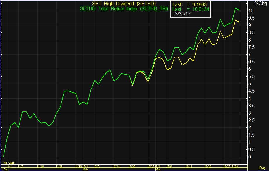 3. หุ้นปันผล เมื่อวัดจาก SET High Dividend Index และ SETHD Total Return Index บวกจากปีก่อน 9.19% และ 10.013 ตามลำดับ .. ถ้ามีเงินเริ่มต้น 1,000,000 บาท วันนี้เงินจะเพิ่มเป็น 1,101,340 บาท .. ไตรมาสนี้หุ้นปันผลวิ่งแรงแซงเพื่อนไปไกล