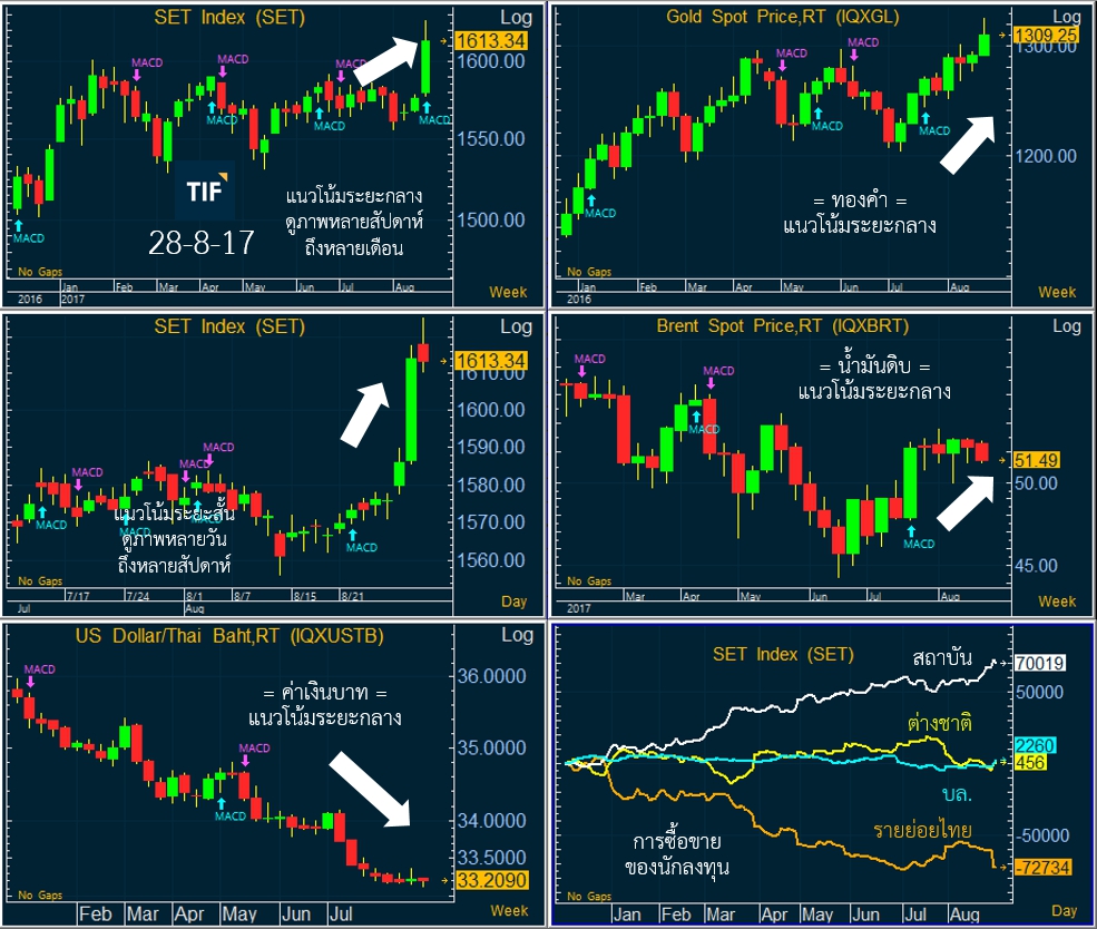 - แนวโน้ม SET Index — ปิดทรงตัว หลังจากที่บวกแรงเมื่อวาน แนวโน้มระยะสั้น (กราฟ Day) ยังเป็นขาขึ้นได้อยู่ และทำให้แนวโน้มระยะกลาง (กราฟ Week) เป็นขาขึ้นอย่างไม่เป็นทางการด้วยเช่นกัน (ขาลง/ขาขึ้น ให้ดูที่ทิศทางลูกศร MACD ในกราฟของรูปด้านบนสุด)