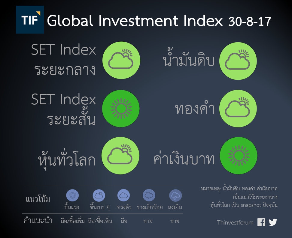 - ข้อมูลตลาดหุ้นจะใช้ SET Index เป็นตัวแทน เพื่อให้นำเสนอข้อมูลภาพรวมได้จริงในทางปฏิบัติ ภาวะของหุ้นรายตัวอื่น ๆ อาจต่างไปจากภาวะของตลาดโดยรวมก็ได้ นักลงทุนจึงควรพิจารณาสถานะของหุ้นรายตัวที่นักลงทุนสนใจ ควบคู่กันไป ♦