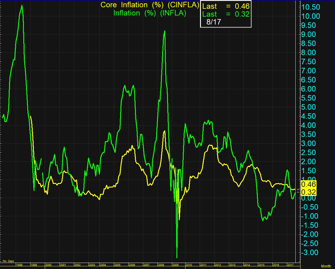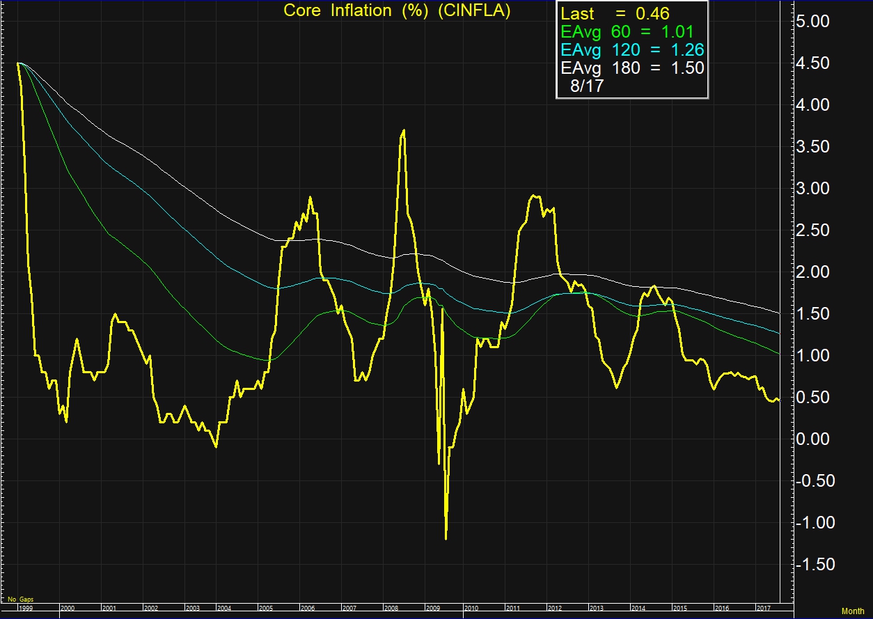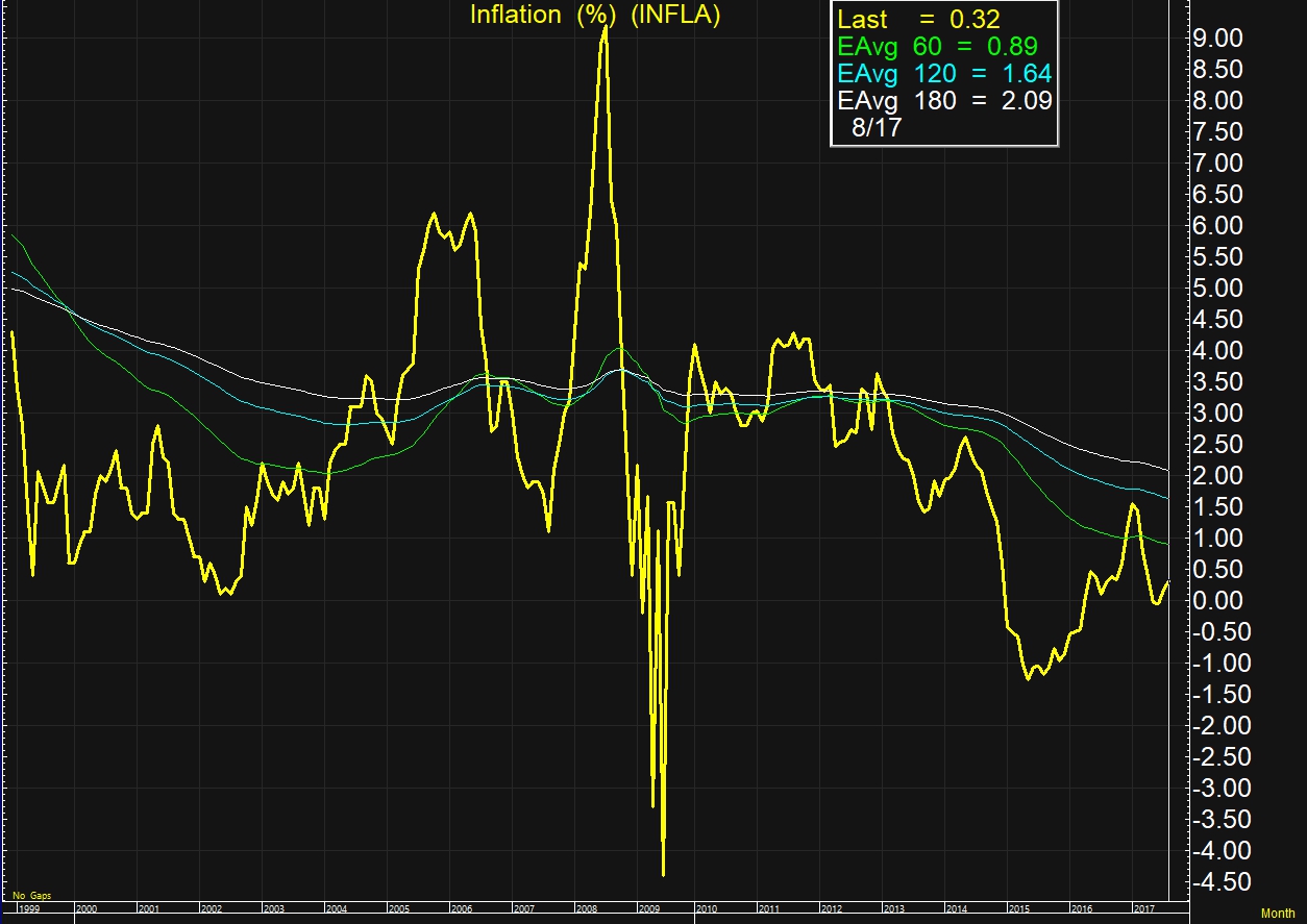 - ตัวเลขล่าสุด ณ สิงหาคม 2560 คือ 0.46% ต่อปี (ราคาสินค้าและบริการ เพิ่มขึ้น 0.46% จากเดือนสิงหาคม 2559 หรือที่เรียกว่า Year-on-Year Comparison)