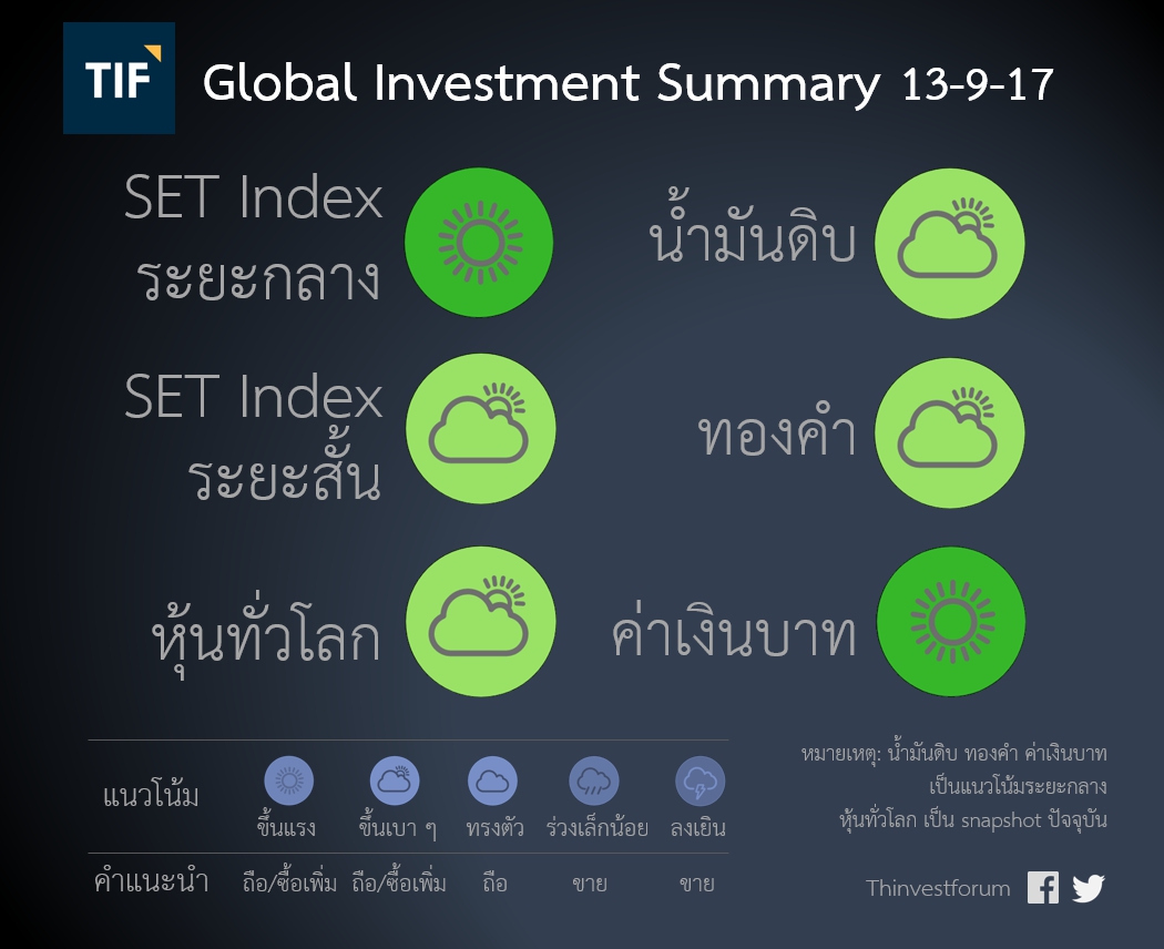 - ข้อมูลตลาดหุ้นจะใช้ SET Index เป็นตัวแทน เพื่อให้นำเสนอข้อมูลภาพรวมได้จริงในทางปฏิบัติ ภาวะของหุ้นรายตัวอื่น ๆ อาจต่างไปจากภาวะของตลาดโดยรวมก็ได้ นักลงทุนจึงควรพิจารณาสถานะของหุ้นรายตัวที่นักลงทุนสนใจ ควบคู่กันไป