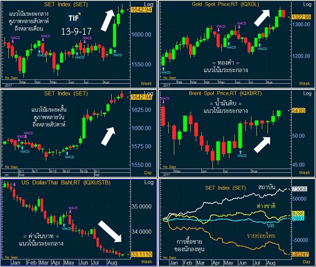 - แนวโน้ม SET Index — ปิดตลาดแบบทรงตัว แต่ยังดูดีต่อเนื่องจากสัปดาห์ก่อน แนวโน้มระยะสั้น (กราฟ Day) เป็นขาขึ้น และแนวโน้มระยะกลาง (กราฟ Week) ก็เป็นขาขึ้นด้วยเช่นกัน (ขาลง/ขาขึ้น ให้ดูที่ทิศทางลูกศร MACD ในกราฟของรูปด้านบนสุด)