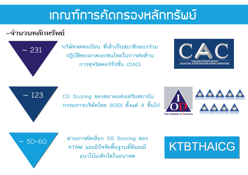 KTBTHAICG จะเน้นลงทุนในหุ้นของบริษัทจดทะเบียนใน SET Index หรือ mai ที่มีการกำกับดูแลกิจการที่ดี ผ่านการรับรองเป็นสมาชิกแนวร่วมปฏิบัติของภาคเอกชนไทยในการต่อต้านการทุจริตคอรัปชั่น (CAC) รวมถึงได้รับการจัดอันดับ CG Scoring ระดับ 4 ดาวขึ้นไปโดยสมาคมส่งเสริมกรรมการบริษัทไทย (IOD)