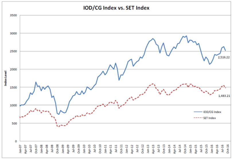 ทั้งนี้ ที่ผ่านมาหุ้นที่มีลักษณะตามเกณฑ์ธรรมาภิบาล (พิจารณาจาก IOD/CG Index) ให้ผลตอบแทนสูงกว่า SET Index อย่างมีนัยสำคัญ
