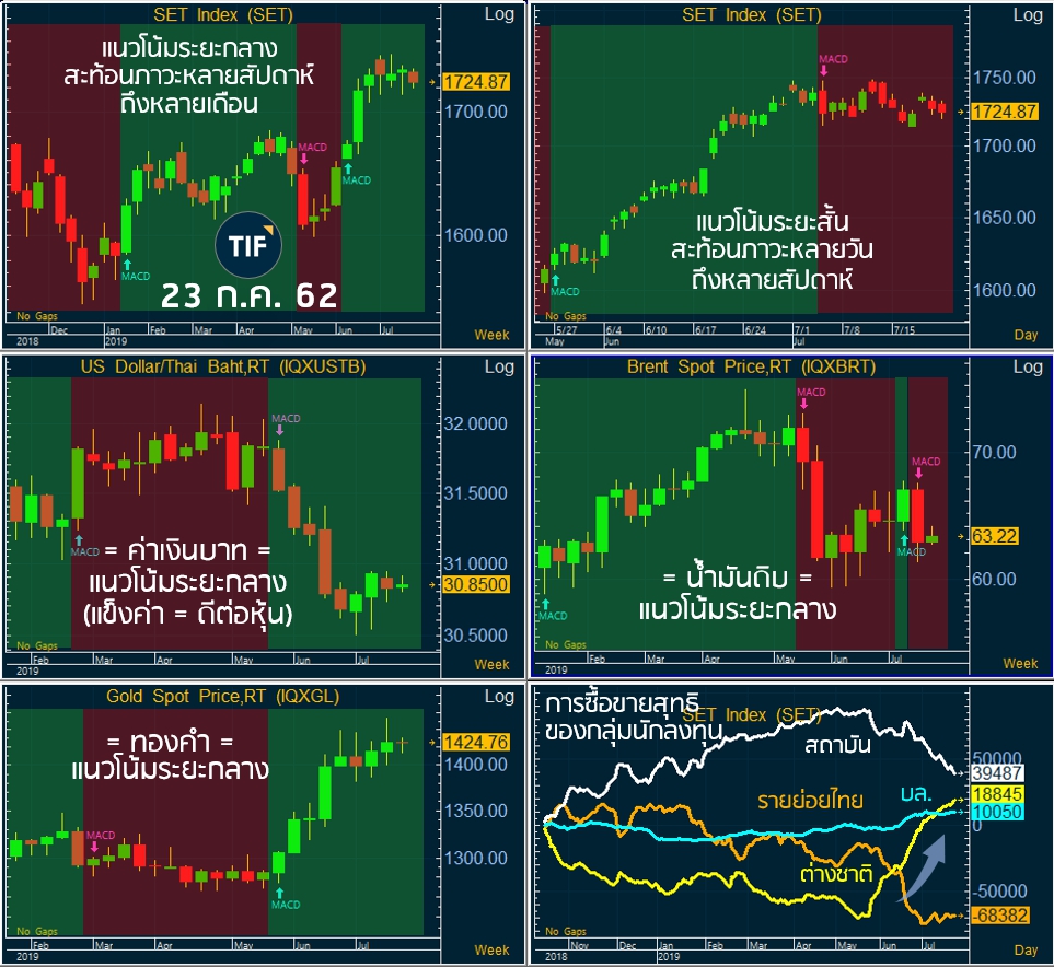 - SET Index — ระยะกลาง (ภาพ Weekly) ยังเป็นขาขึ้นตั้งแต่กลางเดือนก่อน แต่ระยะสั้น (ภาพ Daily) หลังเจอเทไปช่วงต้นเดือน จึงยังคงเป็นขาลง .. โดยที่แนวโน้มขาลง/ขาขึ้น ให้ดูที่ทิศทางลูกศร MACD และแถบสีเขียว (แนวโน้มดีต่อนักลงทุน)/สีแดง (แนวโน้มแย่ต่อนักลงทุน) ในกราฟ
