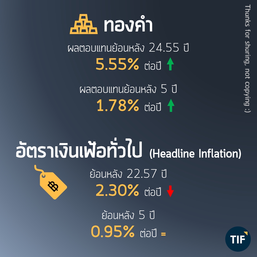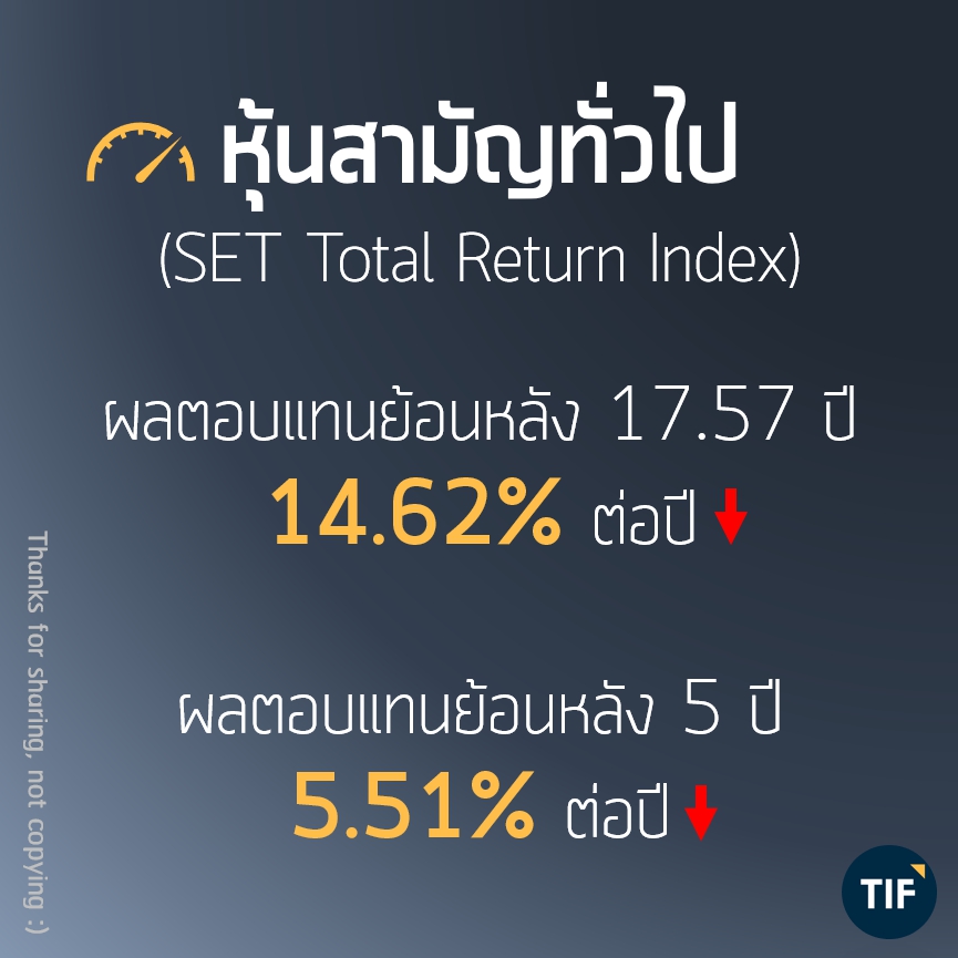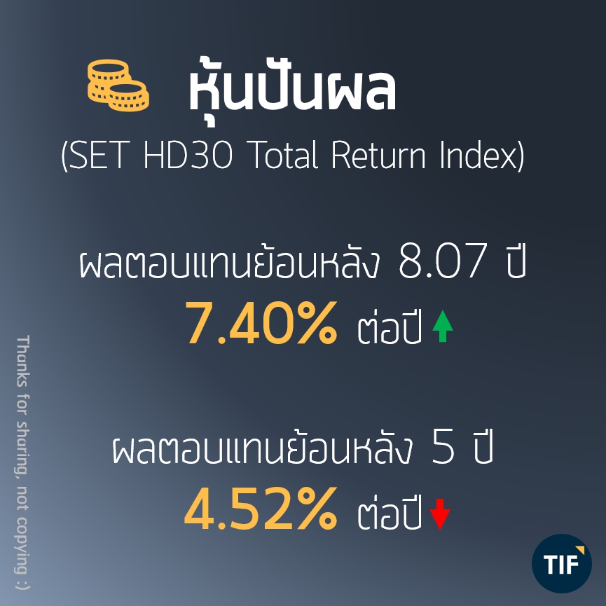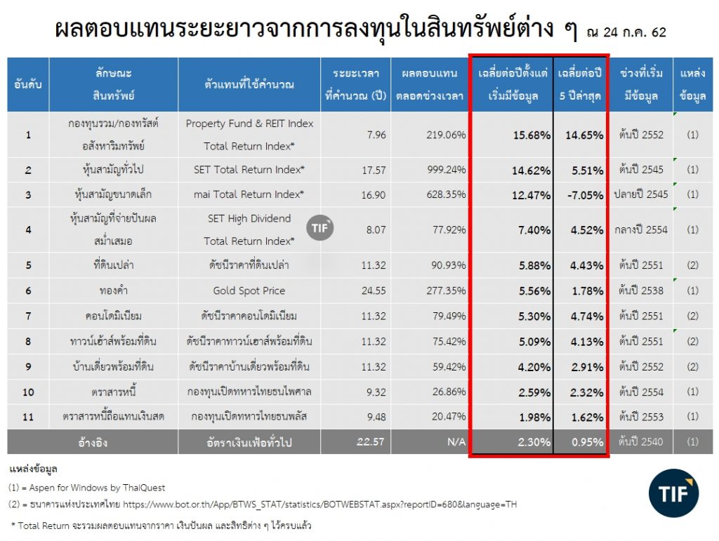 ข้อมูลต่อไปนี้จะช่วยให้เห็นภาพว่า การลงทุนในอะไร ให้ผลตอบแทนประมาณไหนในระยะยาว เท่าที่พอจะมีข้อมูลย้อนหลังให้คำนวณได้ (อย่ามาถามว่าทำไมไม่ย้อนไกลกว่านี้ .. ไม่มีข้อมูลจ้า !!) รวมถึงระยะยาวที่สั้นมาหน่อยคือ 5 ปีล่าสุด เพื่อให้เห็นค่าเฉลี่ยในยุคปัจจุบันด้วย