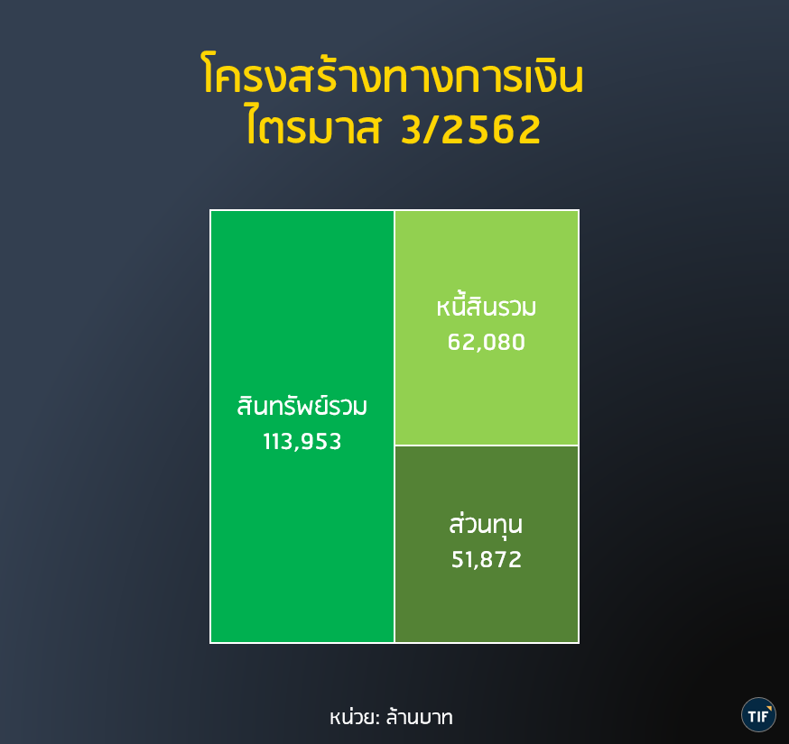 ด้านโครงสร้างทางการเงิน ในไตรมาส 3/2562 ตามงบการเงินรวม TPIPL มีสินทรัพย์รวมทั้งสิ้น 113,953 ล้านบาท แบ่งเป็นสินทรัพย์หมุนเวียน 27,776 ล้านบาท และสินทรัพย์ไม่หมุนเวียน 86,177 ล้านบาท และมีหนี้สินรวมทั้งสิ้น 62,080 ล้านบาท แบ่งเป็นหนี้สินหมุนเวียน 16,978 ล้านบาท และหนี้สินไม่หมุนเวียน 45,102 ล้านบาท โดยมีส่วนของผู้ถือหุ้น 51,872 ล้านบาท ด้านอัตราส่วนทางการเงิน ในไตรมาส 3/2562 TPIPL มีอัตราส่วนสภาพคล่องดีขึ้นจากช่วงไตรมาสเดียวกันของปีก่อน โดยในไตรมาส 3/2562 TPIPL มีอัตราสภาพคล่อง 1.64 เท่า เมื่อเทียบกับไตรมาส 3/2561 ซี่งมีอัตราส่วนสภาพคล่อง 1.29 เท่า