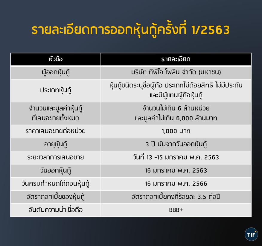ทั้งนี้ หุ้นกู้ที่จะออกครั้งที่ 1/2563 ได้รับการประเมินความเสี่ยงด้านเครดิต โดยบริษัท ทริสเรทติ้ง จำกัด ที่ระดับ BBB+ แนวโน้มอันดับเครดิต “Positive” และมีราคาเสนอขายอยู่ที่ 1,000 บาทต่อหน่วย ซึ่งการเสนอขายหุ้นกู้ครั้งนี้ จะเสนอขายแก่ทั้งนักลงทุนสถาบัน และนักลงทุนทั่วไป ผู้ที่สนใจสามารถจองซื้อหุ้นกู้ TPIPL ได้ตั้งแต่วันที่ 13 มกราคม 2563 ถึงวันที่ 15 มกราคม 2563 ผ่าน ธนาคาร ซีไอเอ็มบี ไทย จำกัด (มหาชน) โดยนักลงทุนจะต้องจองซื้อขั้นต่ำ 100 หน่วย หรือ 100,000 บาท