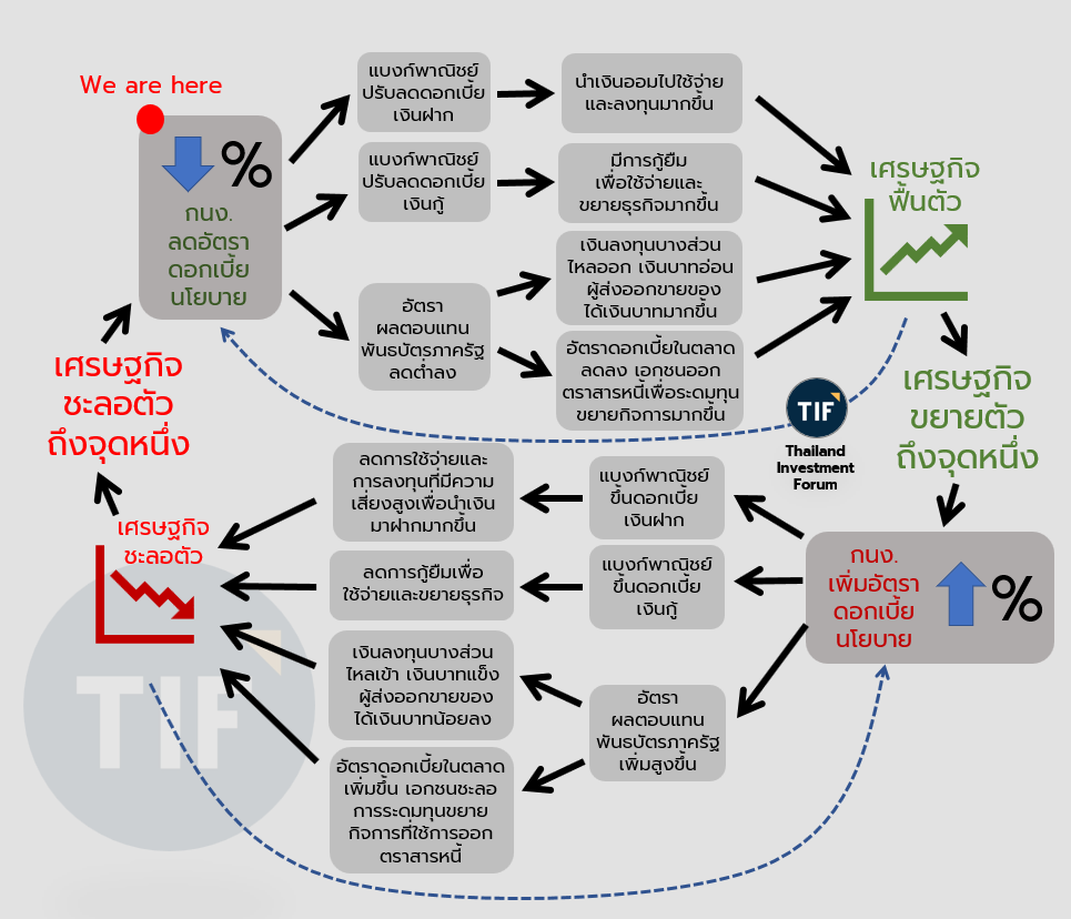 เมื่อเศรษฐกิจชักจะเหงาหงอย เติบโตต่ำ ซึ่งเปรียบเหมือนรถยนต์ที่วิ่งช้าลงจนแทบหยุด โดยหลัก ๆ ก็จะดูจากการเติบโตผลิตภัณฑ์มวลรวมภายในประเทศ (Gross Domestic Production หรือ GDP) ที่ชะลอตัว ยอดการส่งออกสุทธิที่ลดลง และอัตราเงินเฟ้อที่ต่ำลง คณะกรรมการนโยบายการเงิน (กนง.) ก็จะเหยียบคันเร่งด้วยการ “ปรับลดอัตราดอกเบี้ยนโยบาย” เพื่อส่งสัญญาณให้กลไกหลักในตลาดการเงิน ซึ่งก็คือแบงก์พาณิชย์ ปรับลดดอกเบี้ย เพื่อกระตุ้นให้เศรษฐกิจมีแรงฮึดจนกลับมาคึกคักได้อีกครั้ง กล่าวคือ