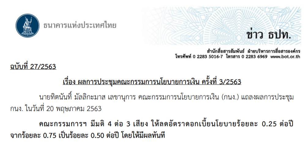 ในการประชุมกนง. เมื่อวันที่ 20 พ.ค. 63 ปรากฏว่า มีมติ 4:3 ให้ลดอัตราดอกเบี้ยนโนบายลงเหลือ 0.50% ต่อปี นับเป็นระดับต่ำสุดเป็นประวัติการณ์ในรอบเกือบ 20 ปี นับตั้งแต่มีการเผยแพร่อัตราดอกเบี้ยนโยบาย