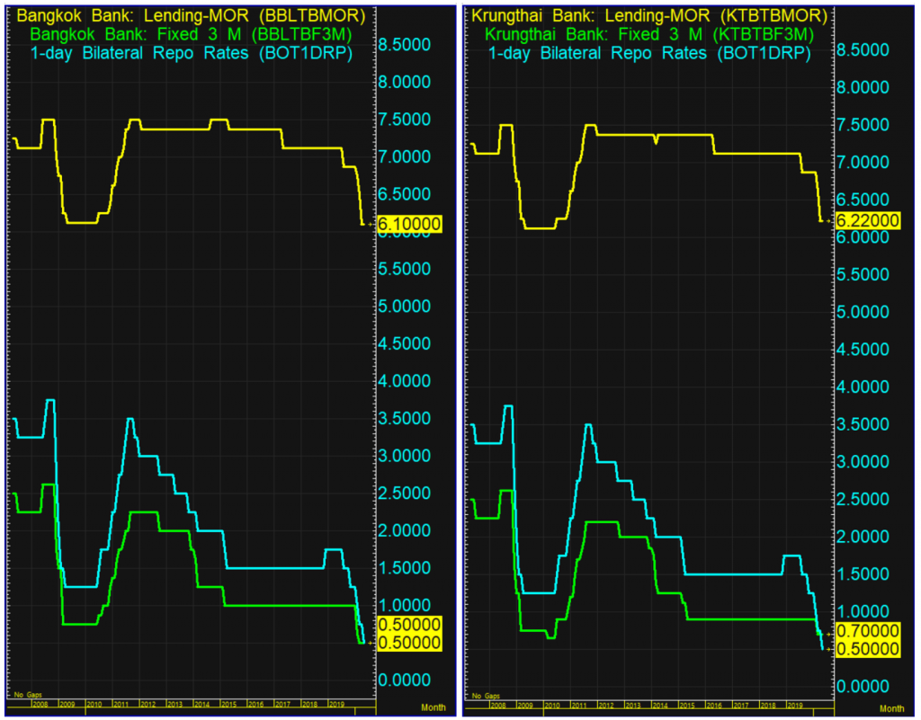 1. อัตราดอกเบี้ยเงินกู้และเงินฝาก มีแนวโน้มลดลงทั้ง 2 ขา ตามอัตราดอกเบี้ยนโยบาย เป็นผลให้ประชาชนและภาคธุรกิจมีแรงจูงใจในการกู้ยืม (เพราะต้นทุนเงินทุนต่ำลง) และ/หรือ ถอนเงินฝากมาใช้จ่ายมากขึ้น (เพราะผลตอบแทนน้อยลง)