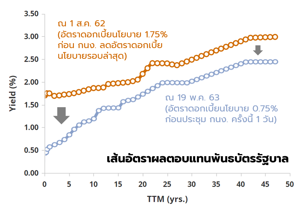 2. อัตราผลตอบแทนพันธบัตรรัฐบาล (และหุ้นกู้เอกชน) ลดต่ำลง ตามแนวโน้มอัตราดอกเบี้ยนโยบาย ทำให้ผลตอบแทนตราสารหนีัทั้งระบบที่ออกใหม่ จะต่ำลง .. แต่ตราสารหนี้ที่มีอยู่เดิมในตลาด จะมีราคาสูงขึ้น (ตามสมการ อัตราดอกเบี้ยในตลาดลด = ราคาตราสารหนี้เพิ่ม)