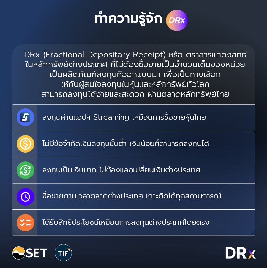 DRx (Fractional Depositary Receipt) หรือ ตราสารแสดงสิทธิในหลักทรัพย์ต่างประเทศที่ไม่ต้องซื้อขายเป็นจำนวนเต็มของหน่วย เป็นผลิตภัณฑ์ลงทุนใหม่จากตลาดหลักทรัพย์แห่งประเทศไทย ออกแบบมาเพื่อเป็นทางเลือกให้กับผู้ที่สนใจลงทุนในหุ้นและหลักทรัพย์ทั่วโลก สามารถลงทุนได้ง่ายและสะดวก ผ่านแอปฯ Streaming เหมือนการซื้อขายหุ้นไทย